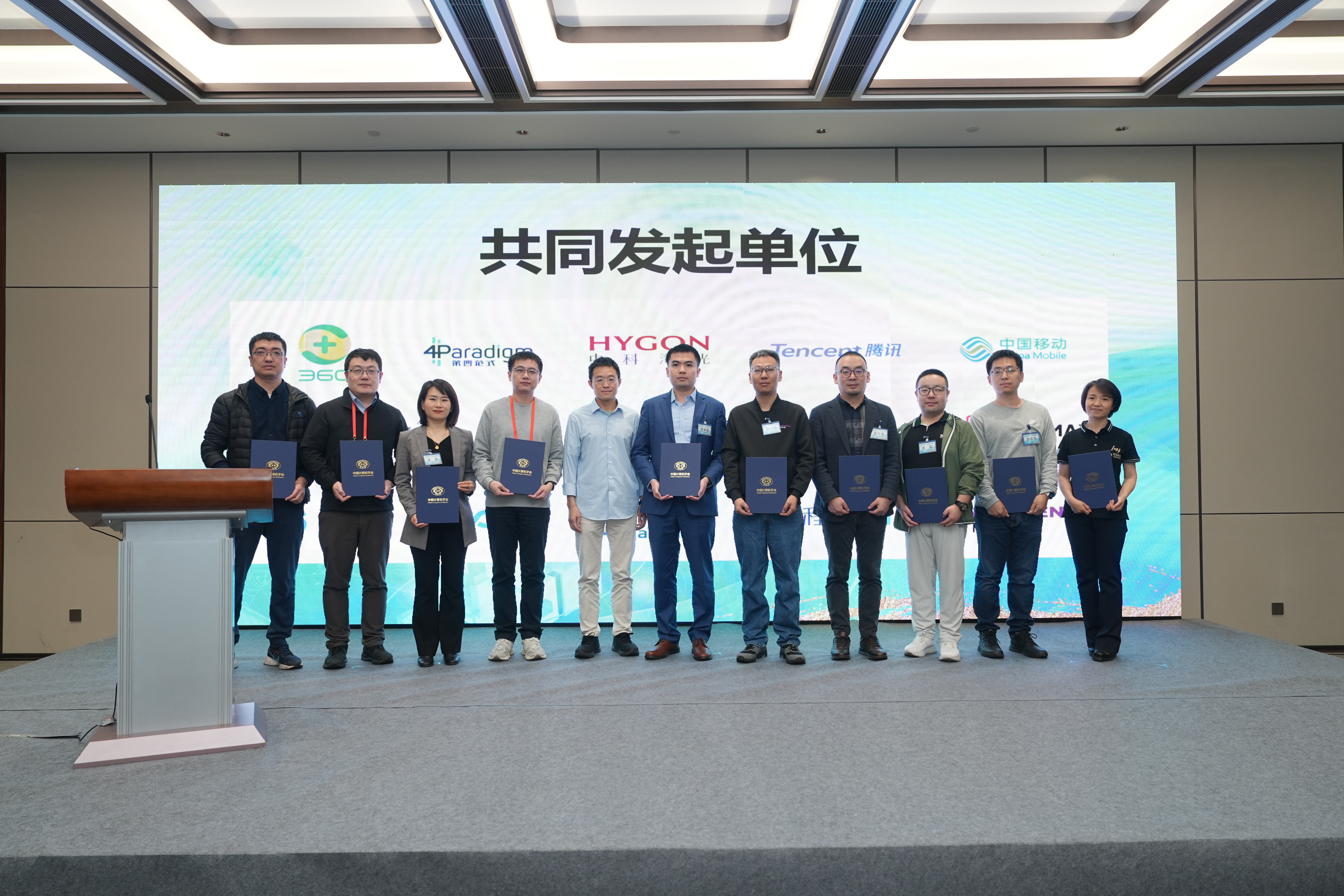 CCF大模型论坛由中国移动、腾讯控股、三六零集团、海光信息、智谱AI、第四范式、稀宇科技、并行科技、无问芯穹、瑞莱智慧科技、面壁智能、生数科技、清程极智、麦伽智能、聆心智能等十余家企业共同发起。现场,唐杰教授为共同发起单位颁发感谢证书。